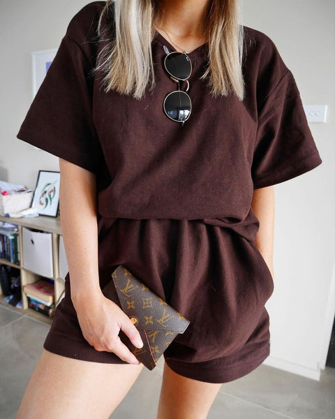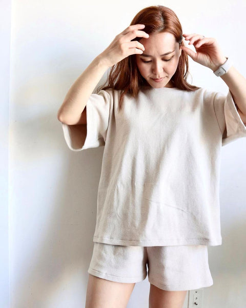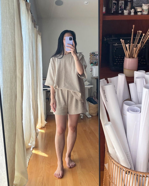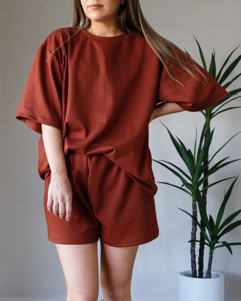 Designed to be a boyfriend fit, this loungewear set is the ideal cross-over between style and comfort. Wear this set lounging around at home or out and about. Featuring a high scoop neckline, loose drop sleeve and high waist relaxed short, these styles look great together or paired back with other styles. I personally love using a ribbed knit fabric (as we have in the images) for this set but you can also opt for: Jersey, ponte, sweat shirting fleece, interlock knit, spandex, double knit, polar fleece, 4-way stretch fabrics such as Lycra, nylon-spandex, high stretch, activewear fabric and any other knitwear fabric.