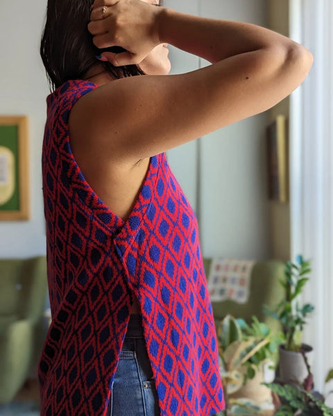 The Viola vest features overlapped side edges which have been rotated to create a slightly flared silhouette, with angled splits at the sides. The neckline boasts a wide V and